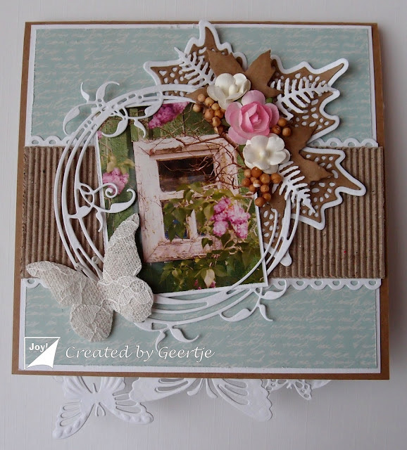 Om en deels achter het plaatje heb ik de sierlijke cirkel met bladeren gebruikt, afgewerkt met een katoenen vlinder